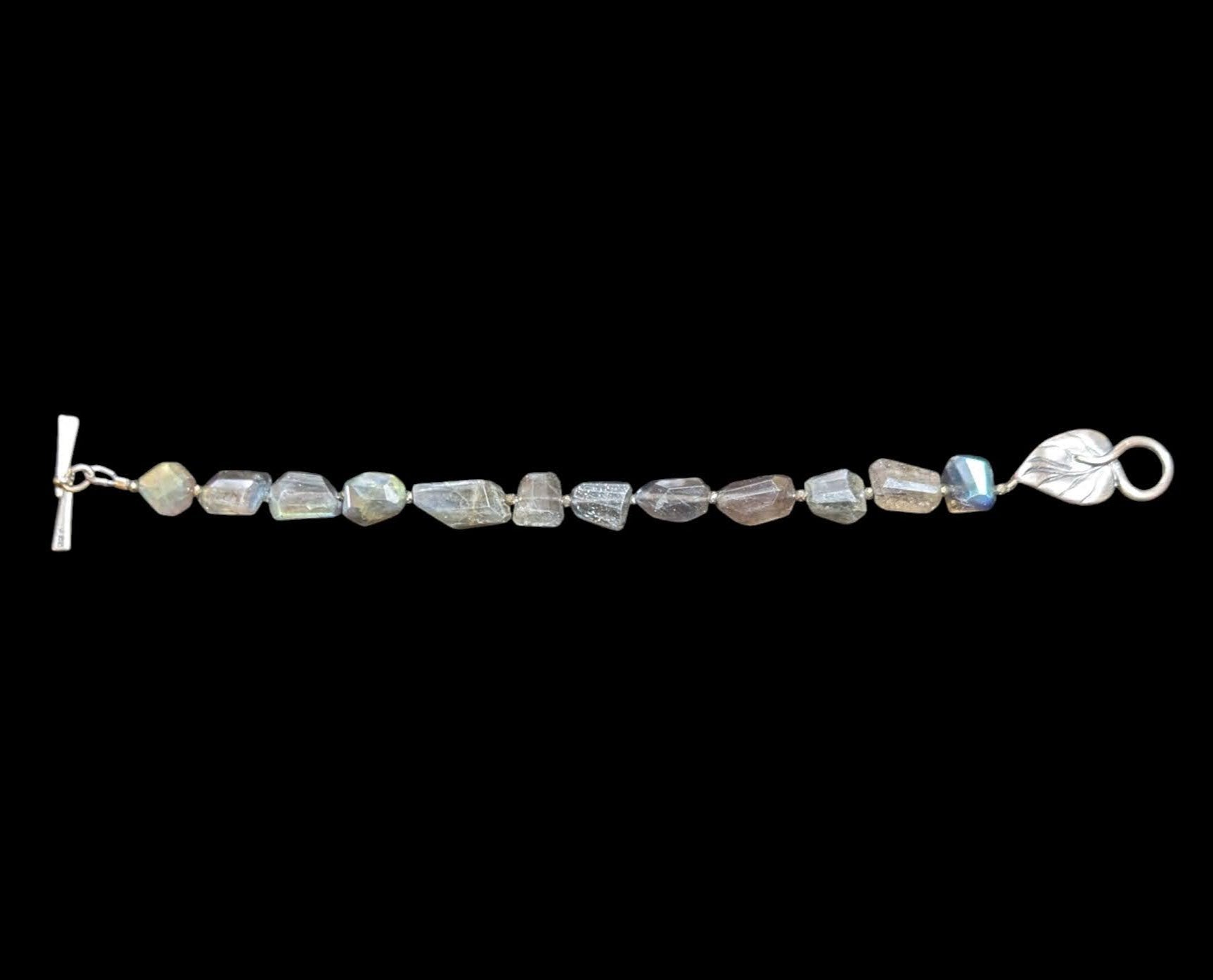 Gorgeous freeform Labradorite and tiny Pyrite beads with engraved antique silver leaf toggle clasp.