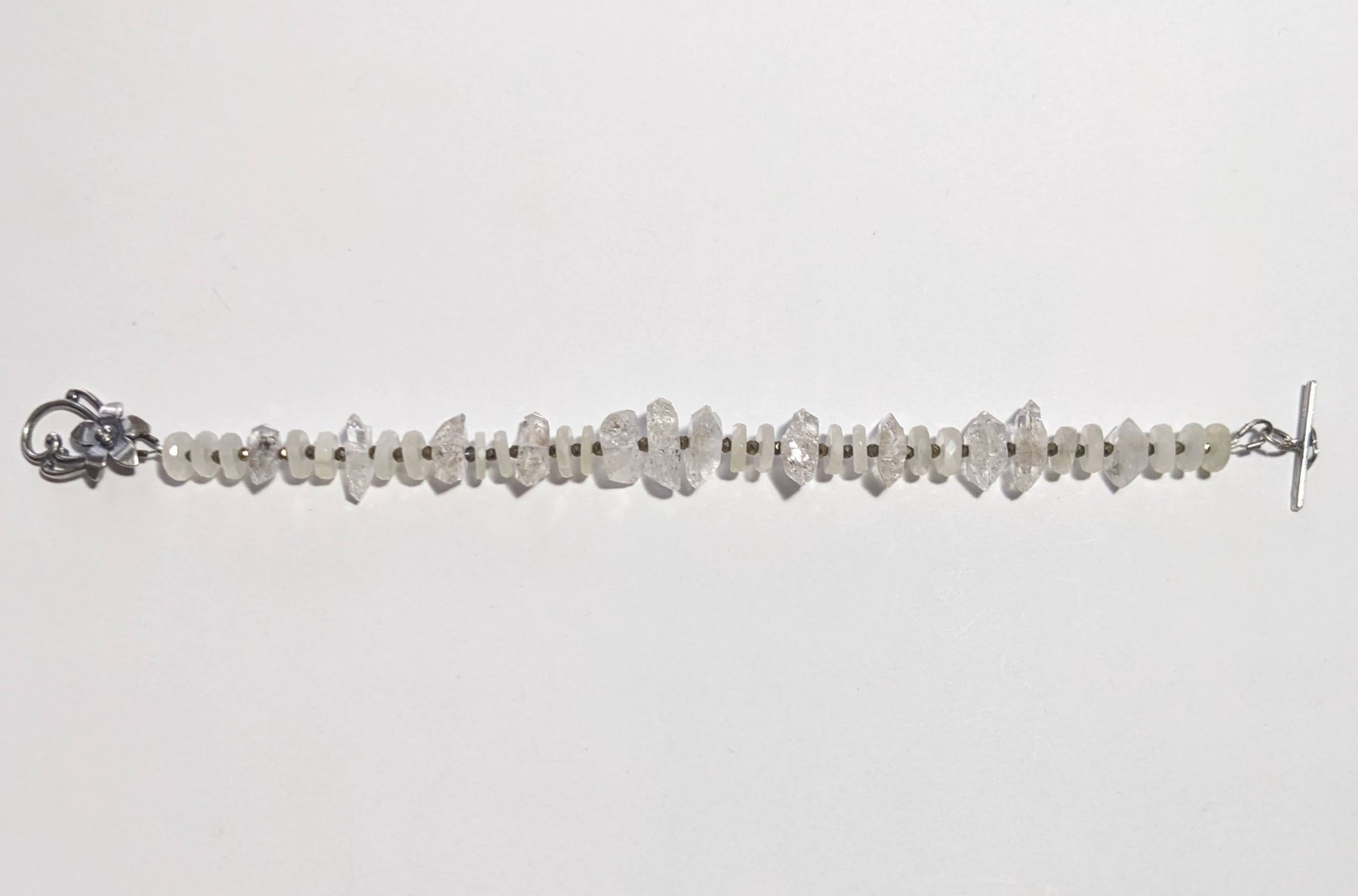 Gorgeous sparkly Herkimer Diamond and Moonstone with tiny Pyrite beads and antique silver Flower toggle clasp.