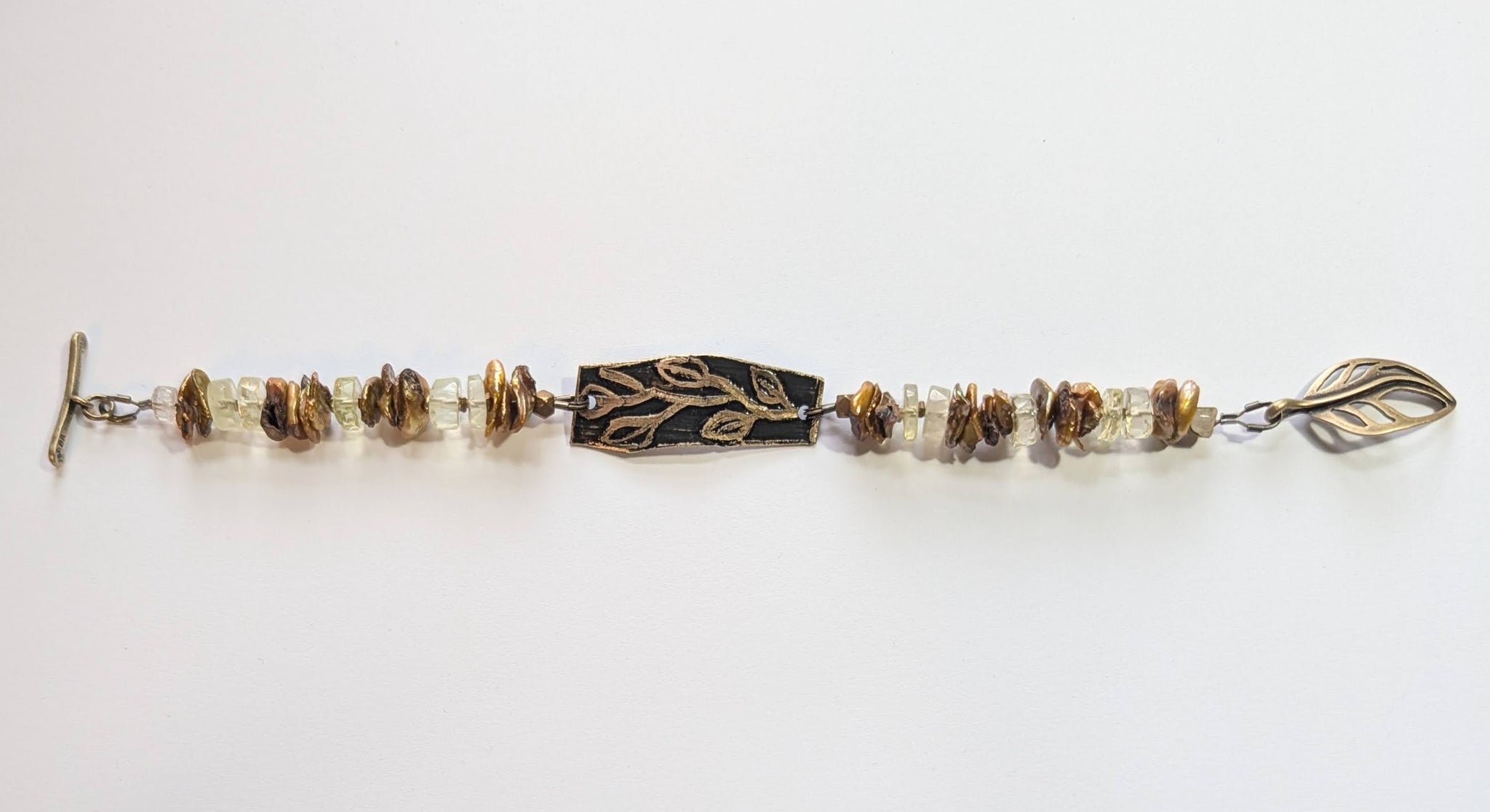 Original art etched brass leaf & vine bracelet with beautiful golden freshwater pearls and faceted Citrine beads and antique brass leaf toggle clasp.