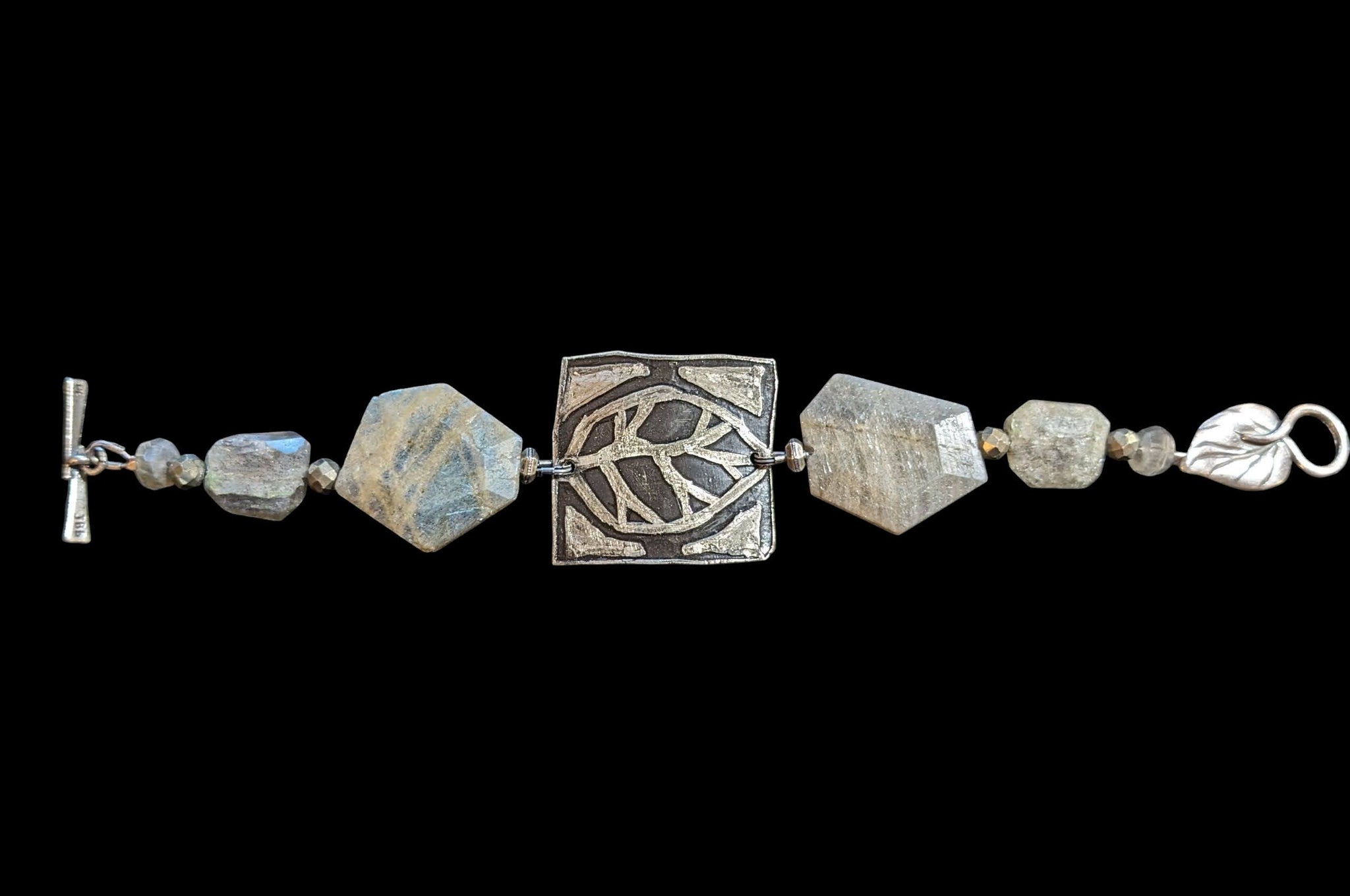Original art etched nickel silver leaf bracelet with gorgeous large Labradorite and faceted Pyrite beads with antique silver pewter leaf toggle clasp.