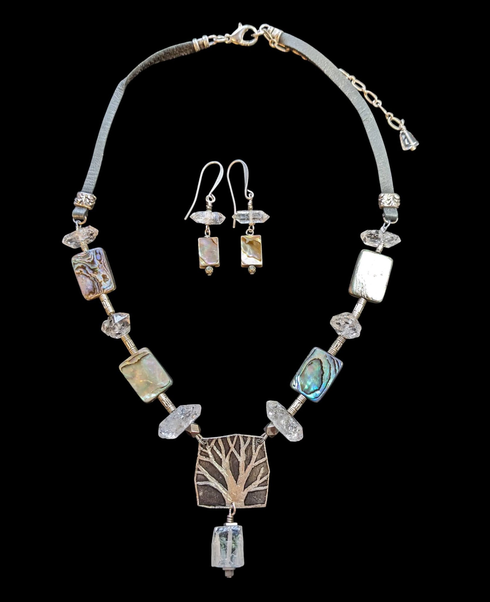 Original art etched nickel silver tree pendant with gorgeous Quartz pendant and  Herkimer Diamond and Abalone shell beads on wide black deerskin cord with antique silver lobster clasp and 3 inch extender chain.