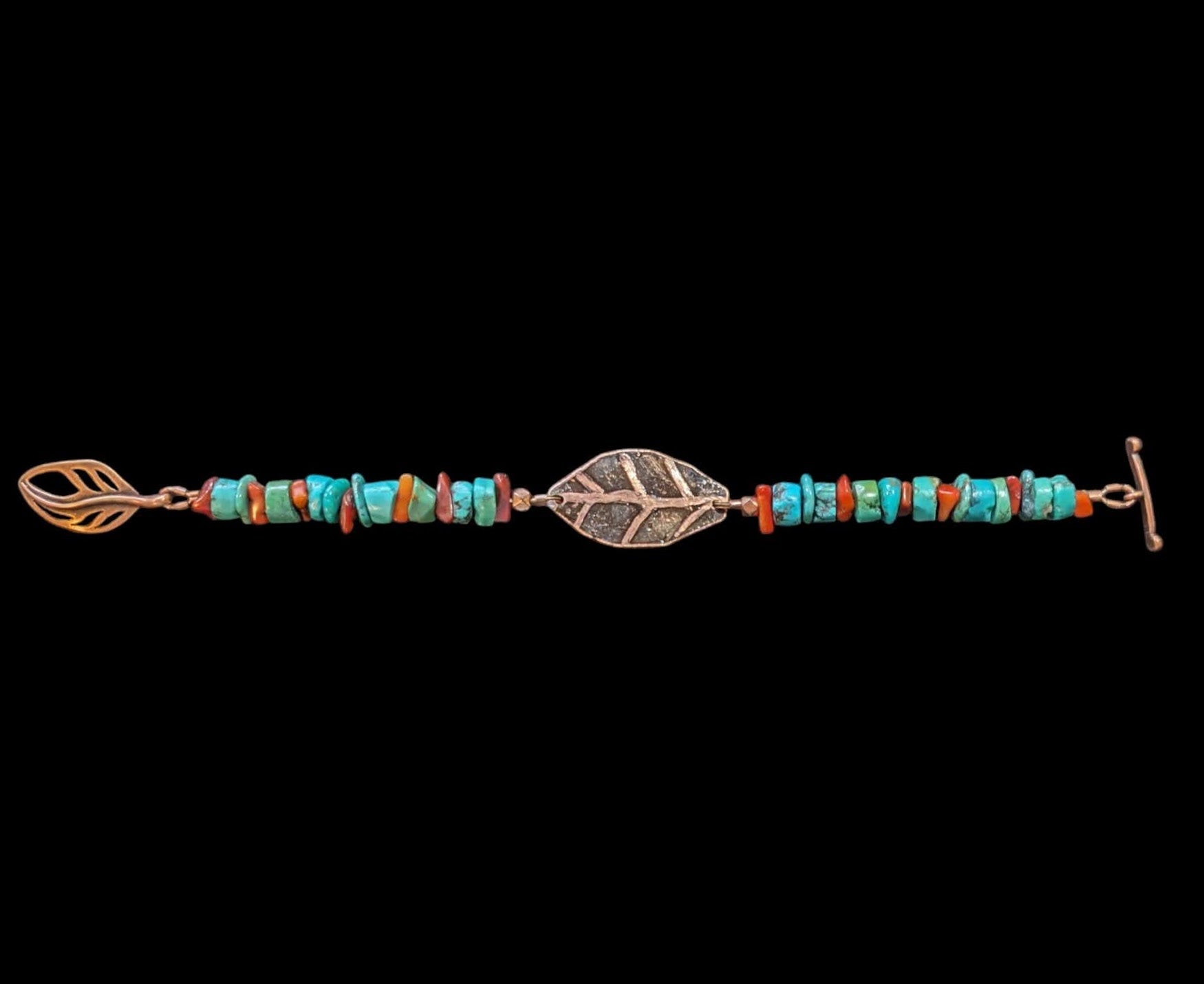 Original art etched copper leaf bracelet wit beautiful Turquoise and Red Creek Jasper chips and antique copper open toggle clasp.