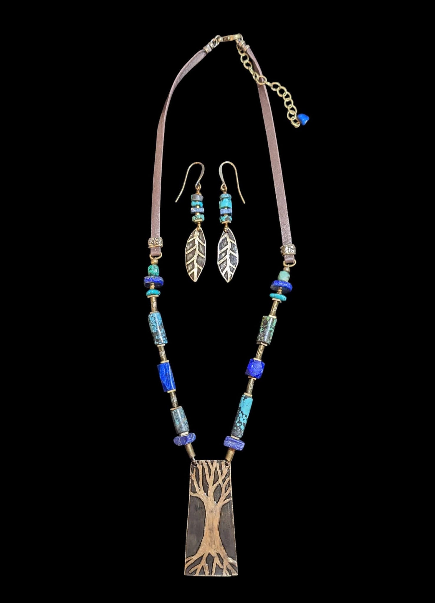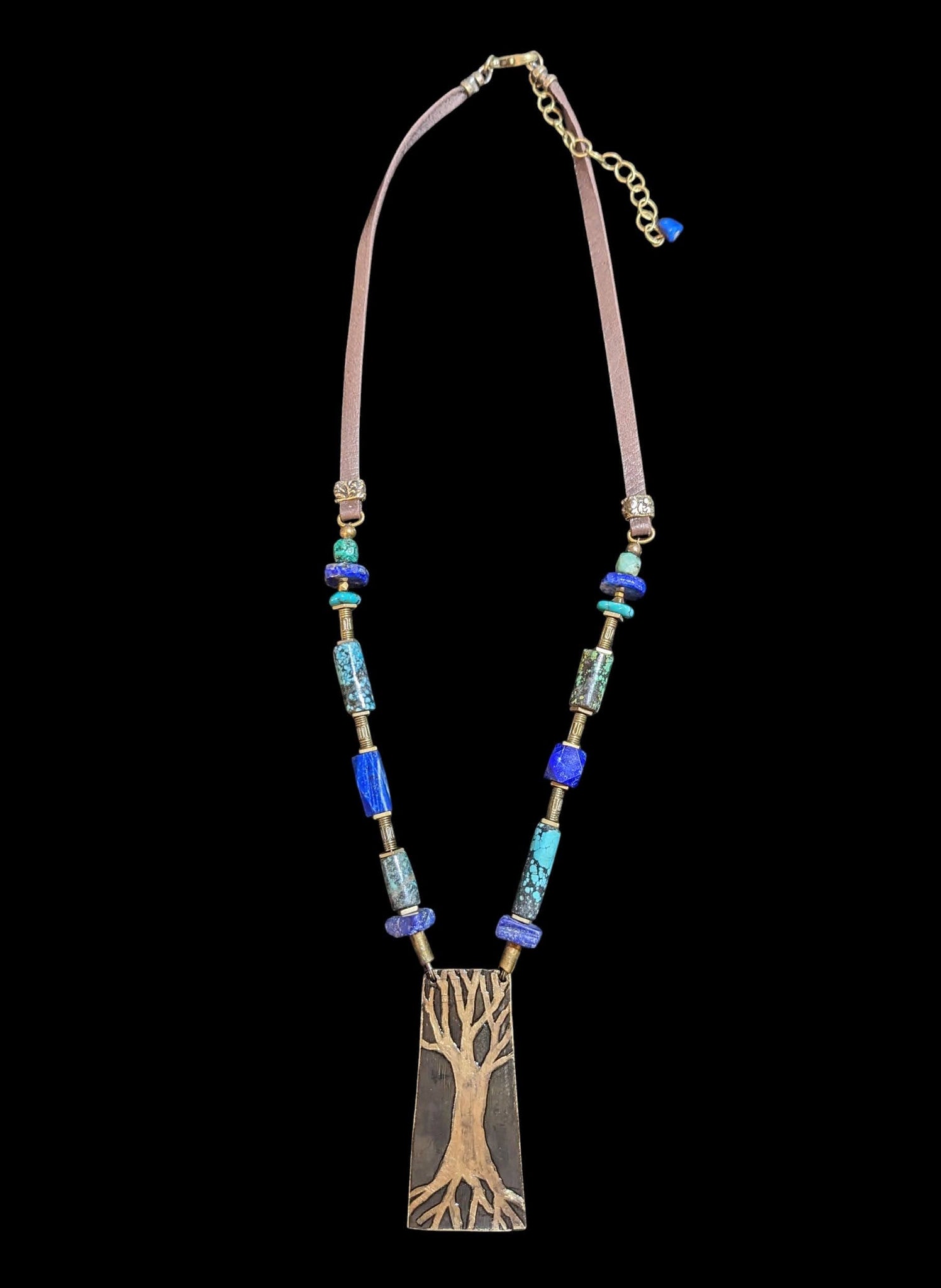 Original art etched brass tree pendant with unique Turquoise and Lapis beads on chocolate brown deerskin cord with antique brass lobster clasp and 3 inch extender chain.