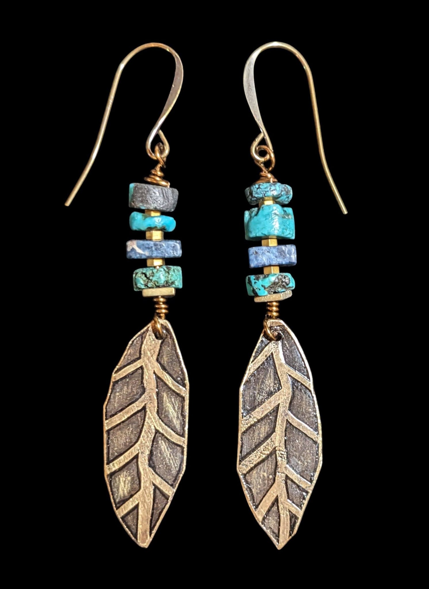 Leaf earrings have antique brass French ear wires and are 2 3/4 inches long.