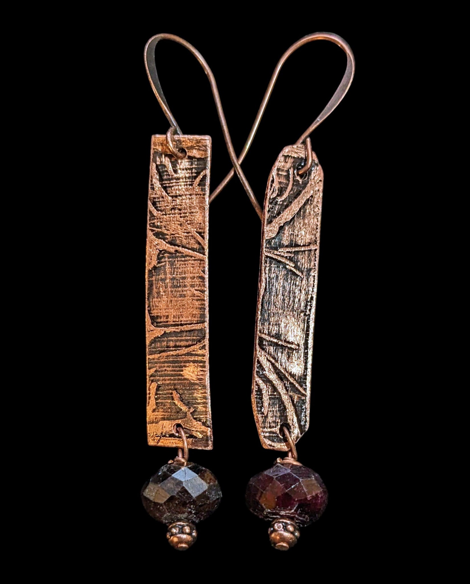 Etched freeform botanical copper earrings with gorgeous faceted Garnet beads on antique copper French ear wires.