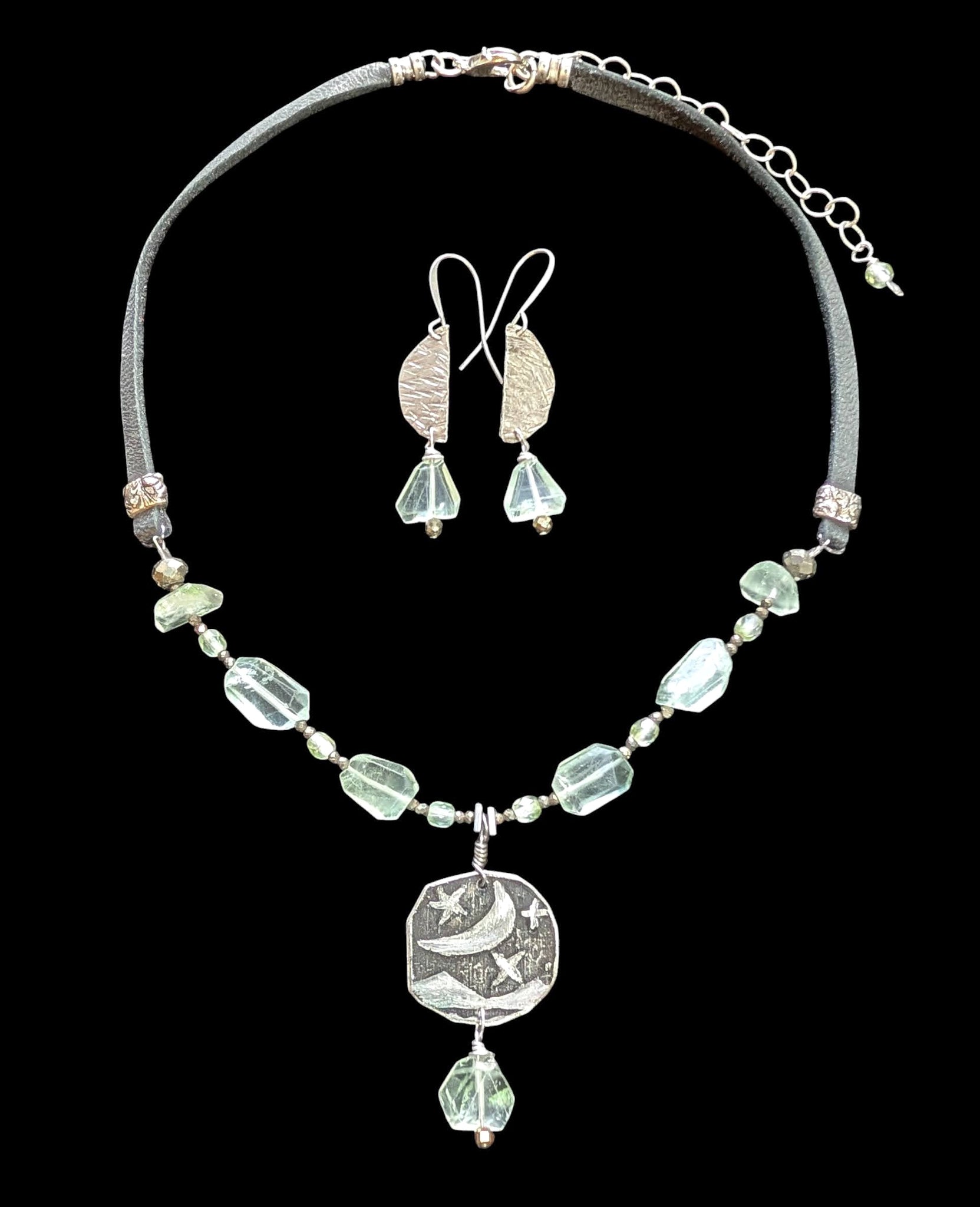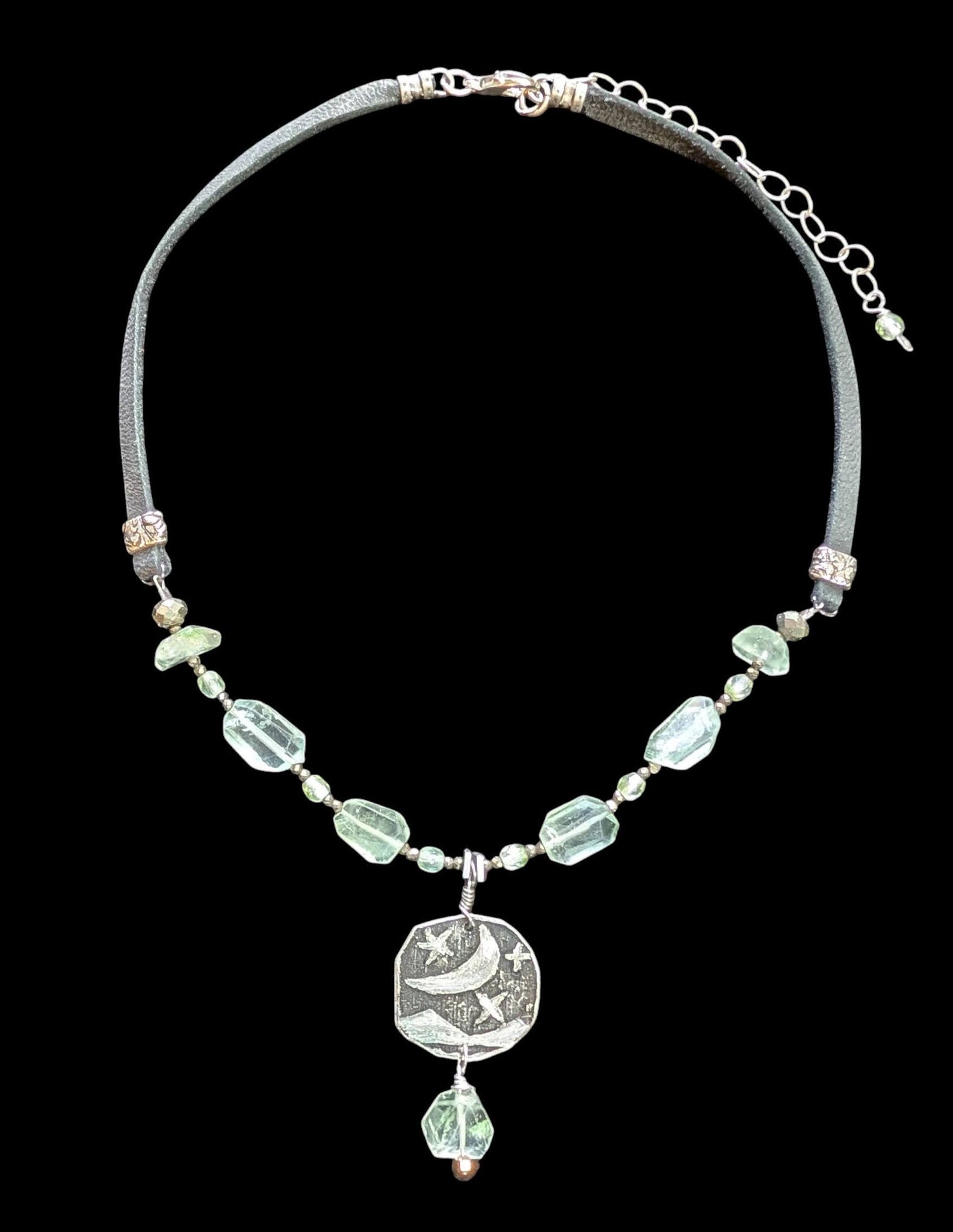 Original art etched nickel silver moon & stars pendant with gorgeous light bluish green faceted Green Amethyst, Pyrite and fire polished glass crystals on black deerskin cord with antique silver lobster clasp and 3 inch extender chain.
