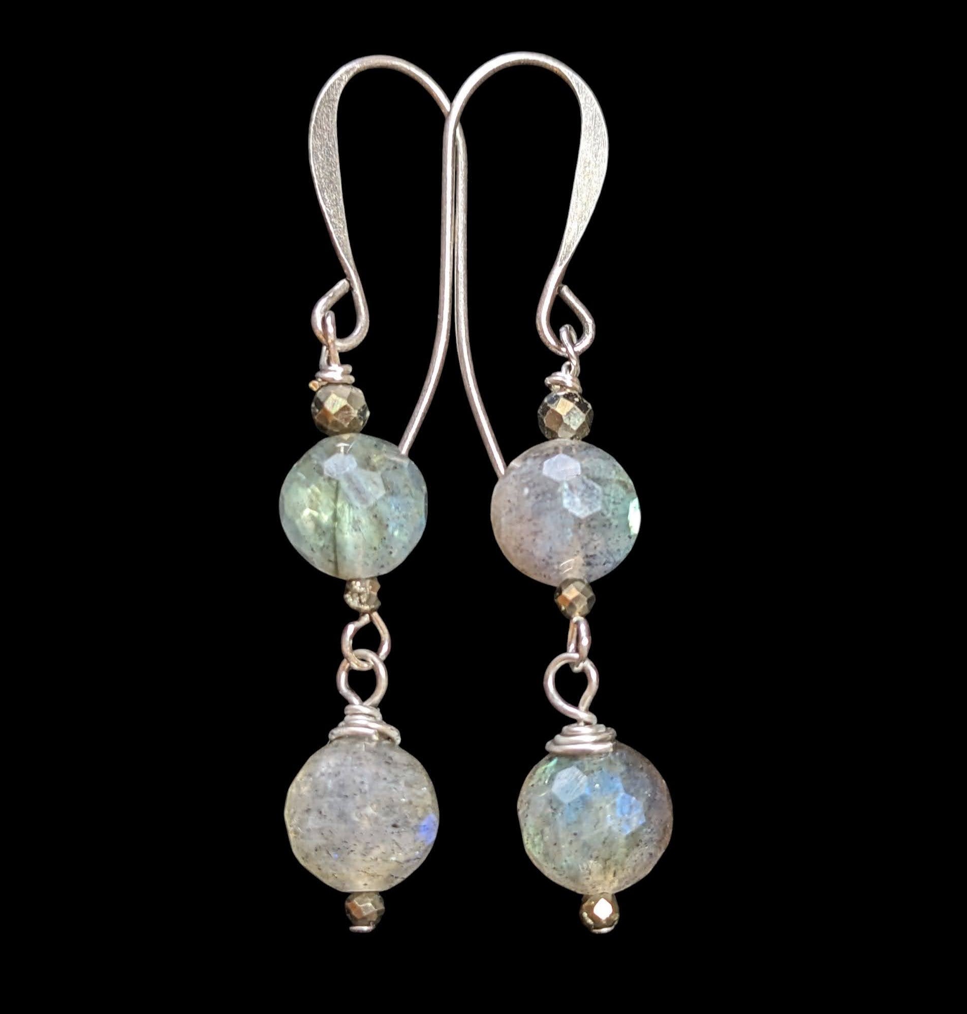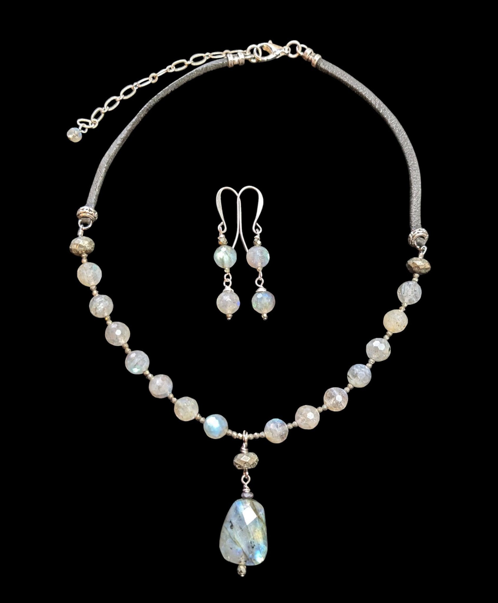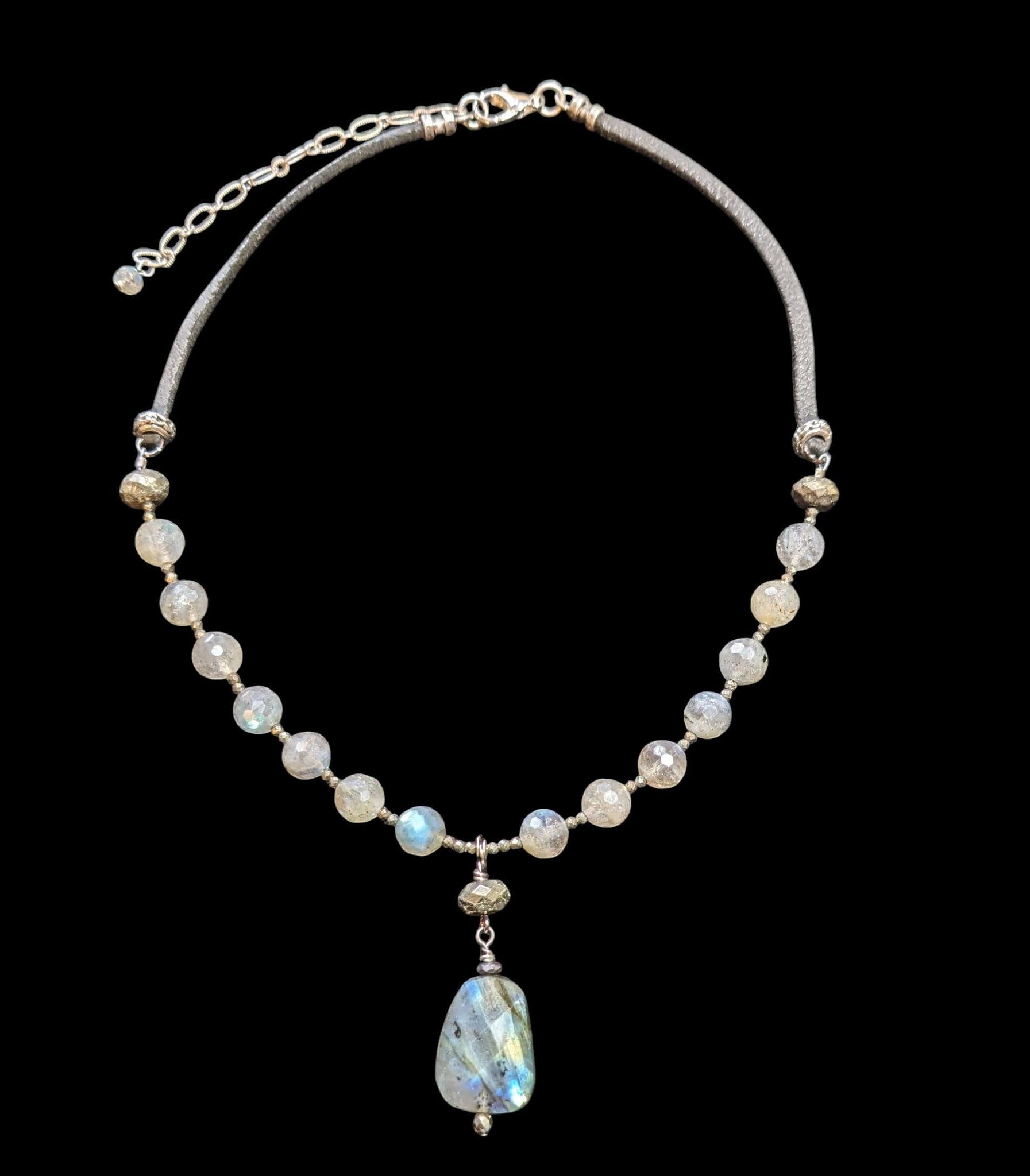 Gorgeous faceted Labradorite pendant and beads with tiny Pyrite beads on narrow black  deerskin cord with antique silver lobster clasp and 3 inch extender chain.